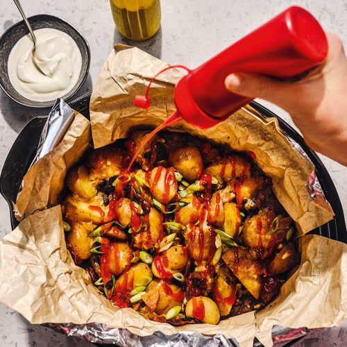 Verdeel de boter erover. Zet het deksel erop en laat 5 uur op de hoge stand of 7 uur op de lage stand koken, tot de aardappels gaar zijn. Serveer met klodders tomatenketchup en zure room en garneer met de gesneden lente-ui.
