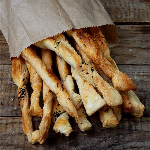 Snijd de plakjes in lange repen van ca. 1½ cm breed en leg deze naast elkaar op een met bakpapier beklede bakplaat. Bak de zoute stengels in de oven in ca. 15 minuten goudbruin en gaar. Laat de stengels op een rooster afkoelen.