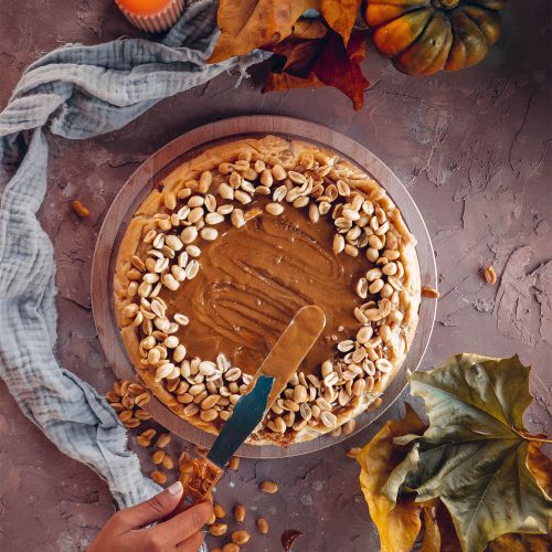 Maak de vulling. Klop de roomkaas in een keukenmachine op hoge snelheid los. Mix de crème fraîche erdoorheen en daarna de basterdsuiker. Meng de eieren er een voor een door en dan achtereenvolgens de eidooier, pindakaas en bloem. Voeg het vanillemerg en de citroenrasp toe en mix het mengsel nog een keer kort door op de hoogste stand.