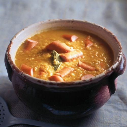 Het recept 'Nigella Lawson: soep van gele spliterwten en Frankfurters' is afkomstig uit het kookboek...