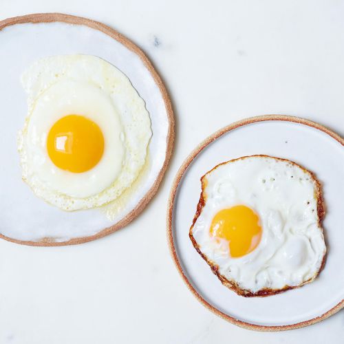 Bij een spiegelei is het wit gestold en zacht, de dooier rond en glanzend en vloeit uit als je erin prikt.