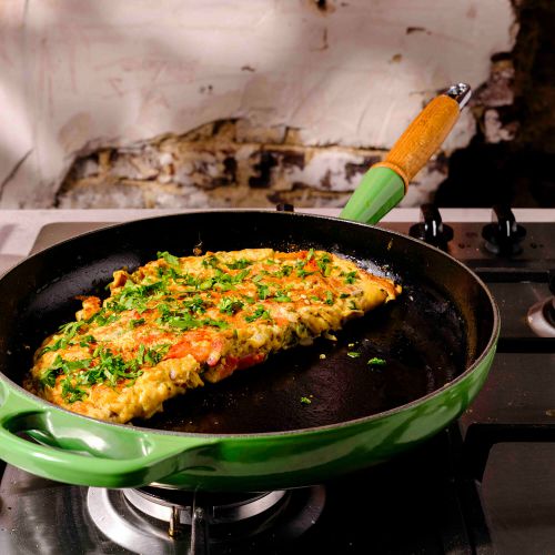 Bak in hete olie of boter tot de eieren goudbruin zijn aan de buitenkant en zacht vanbinnen. Serveer open of dichtgevouwen.