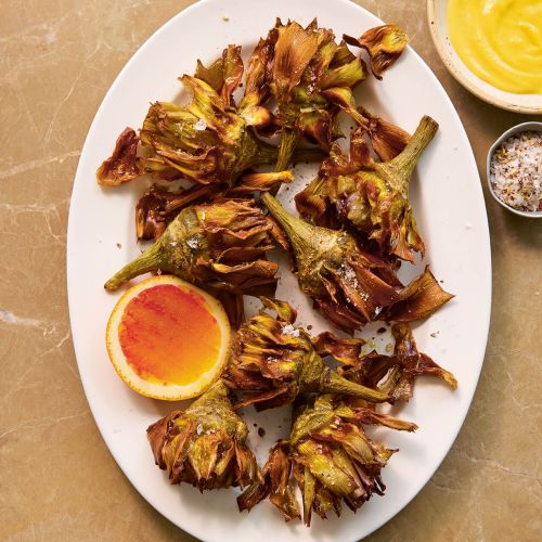 Carciofi alla giudia is een traditioneel recept uit de Romeins-joodse keuken. Het wordt meestal met grote mammole-artisjokken gemaakt, maar wij gebruiken deze kleinere paarse poivrade-artisjokken zodat het gerecht makkelijker is om te delen. Het szechuanzout is verre van traditioneel, maar voegt een tintelende, verdovende sensatie toe. Dat smaakt naar meer als je ze in de aioli van bloedsinaasappel doopt. Eet met je handen!