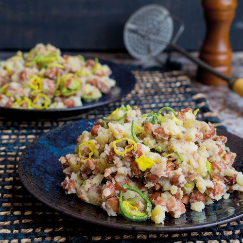 Giet de aardappelen af en stamp ze met de kapucijners tot een puree. Roer de volle melk en een klontje gezouten roomboter erdoor. Meng de prei en de rookspekjes door de puree en breng de stamppot op smaak met zout en peper.