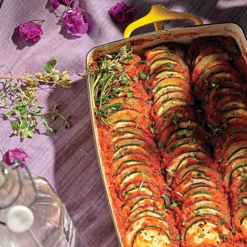 Deze Provençaalse klassieker brengt het beste van de zomeroogst samen (tomaten, paprika's, aubergine en courgette) in een hartige stoofschotel. Dit is een makkelijke versie zonder in te leveren op de smaak, en de presentatie is een knipoog naar de beroemde culinaire animatiefilm Ratatouille.