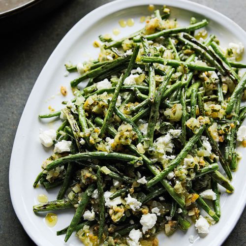 Dien op: schep de helft van de gegrilde sperziebonen op een grote, platte schaal, strooi de helft van de feta erover en schep de helft van de dressing erop. Herhaal met de rest van de bonen, feta en dressing en besprenkel met de extra eetlepel olie.
