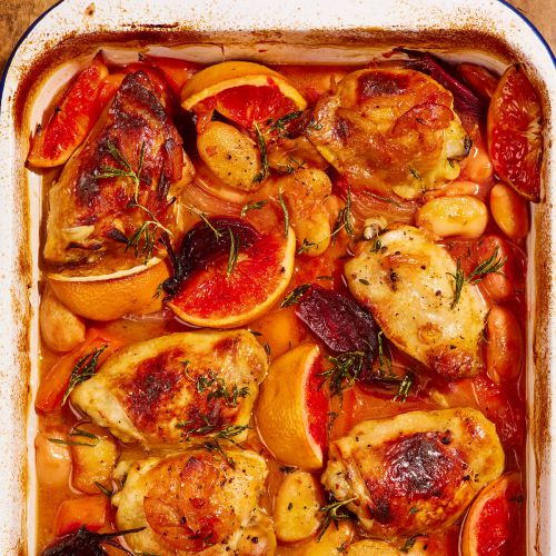 Verwijder de folie, pak de tenen knoflook en knijp ze boven de braadslede uit hun velletjes. Schep om, voeg een extra scheutje bouillon toe als alles er wat droog uitziet, en zet 30 minuten terug in de oven, tot de dijen prachtig goudkleurig en gaar zijn.