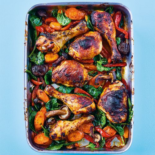 Haal de braadslede uit de oven en voeg meteen de spinazie toe. Roer de blaadjes met een houten lepel door de groenten en kip tot ze geslonken zijn. Laat de kip 5-10 minuten rusten en dien heet op met vers gekookte witte rijst.