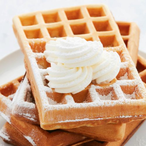 Bestrooi de wafels met de poedersuiker of werk af met roosjes slagroom. Versier naar keuze verder met aardbeien of ander fruit. Dien lauwwarm op.