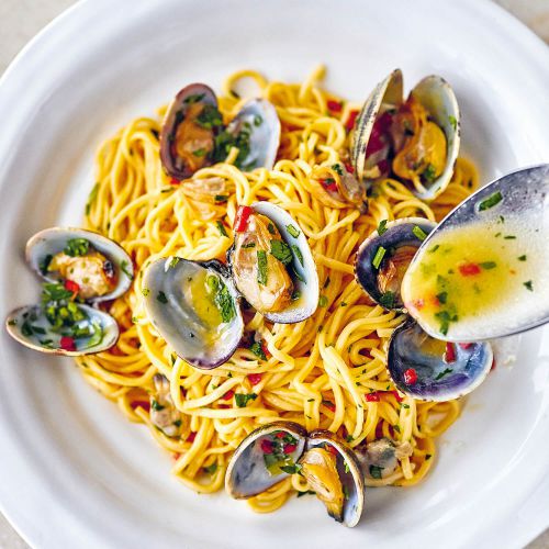 Laat de tagliarini in het kokende water vallen en kook 1½ tot 2 minuten. Schep met een tang uit het water en in de pan met knoflook en chilipeper. Verhoog het vuur tot matig, hussel door elkaar, voeg de venusschelpen en het citroensap toe en bestrooi met de peterselie (of zeekraal). Hussel door elkaar en breng op smaak met zeezout en versgemalen zwarte peper.