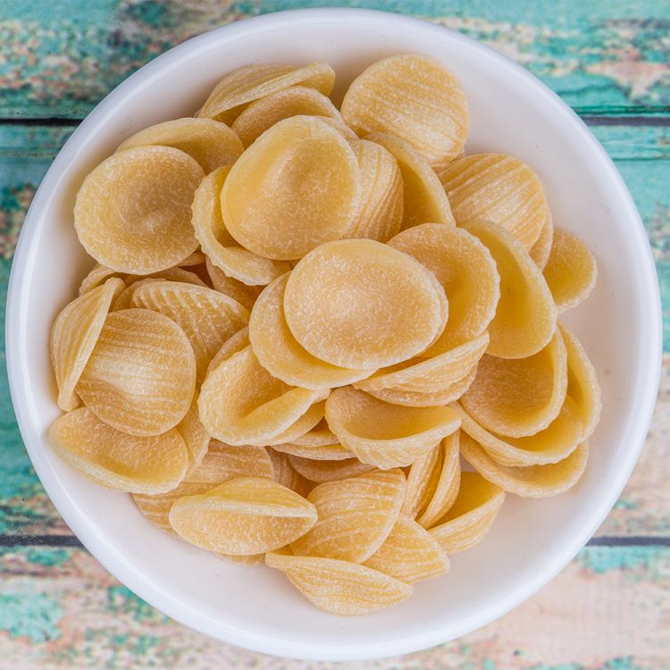 Meng 200 g bloem (liefst Italiaanse 00), 100 g griesmeel en wat zout en maak op het aanrecht een bergje met een kuiltje in het midden. Doe er wat warm water in en meng het tot een stevig, elastisch deeg. Kneed het goed en maak er lange rollen van 2½ cm dik van. Snijd ze in plakjes en trek ze stuk voor stuk met de punt van een mes langzaam over het aanrecht, zodat een soort schelpjes ontstaan. Leg de orecchiette allemaal omgekeerd op de top van uw duim en druk dan op het aanrecht om de holte groter te maken.