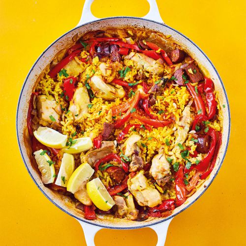 Eenpanspaella met kip, paprika en chorizo