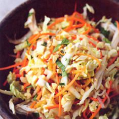 Doe vlak voor het serveren de kipreepjes bij de gezouten sjalot in de kom, samen met de Chinese kool, taugé, geraspte wortel, kruiden en het grootste deel van de pinda's. Giet de dressing erover, kruid royaal met zwarte peper en schep goed door. Schik de salade mooi op een schaal en strooi er voor het opdienen de rest van de pinda's over.