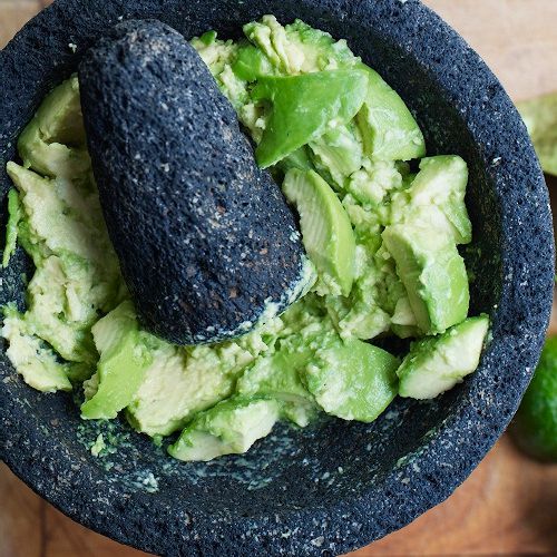 Breng de guacamole op smaak met veel zwarte peper en zout naar smaak. Als de smaak nog niet naar uw zin is, voeg dan naar believen meer limoensap of korianderblad toe.