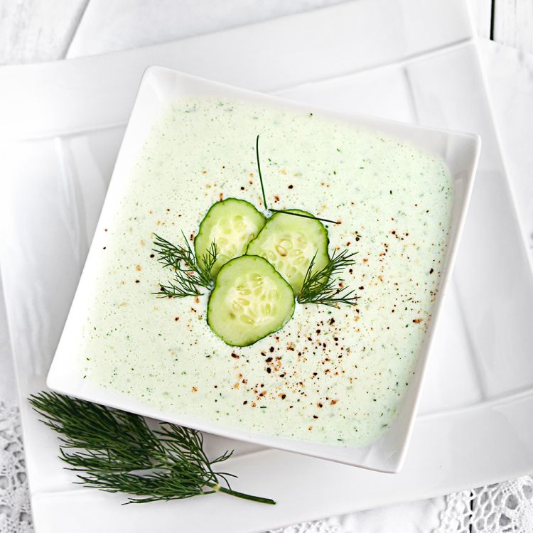 Smelt 30 g boter in een pan en fruit hierin 1 gesnipperde ui tot deze glazig ziet. Roer 30 g bloem erdoor, schenk een deel van 800 ml kippenbouillon erbij en blijf roeren tot een gladde massa ontstaat. herhaal dit tot alle bouillon is opgenomen. Voeg 2 in blokjes gesneden komkommers, 1 ontvelde en in stukjes gesneden tomaat en 1 eetlepel gehakte dille toe en laat de soep onder af en toe roeren 5 minuten zachtjes doorkoken. Klop 125 ml zure room los en verdun deze al roerend met wat van de hete komkommersoep. Schenk dit mengsel al roerend bij de resterende soep, maar laat deze niet meer koken. Breng op smaak met zout, peper en citroensap. Strooi er vlak voor het serveren 1-2 lepels gehakte peterselie over.