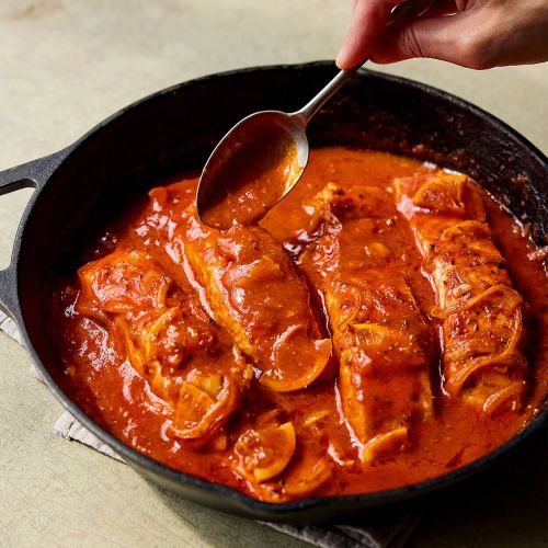 Samaka harra, wat letterlijk vertaald 'pittige vis' betekent, wordt vooral in kustplaatsen in de Levant gegeten (Syrië, Libanon en Palestina). Ik at het voor het eerst in de Syrische havenstad Latakia en stond versteld van hoe lekker het was, hoewel het een heel eenvoudig gerecht is. Het geheim, werd me verteld, zat hem in de die ochtend gevangen zeebrasem uit de Middellandse Zee. 'Dat valt niet na te maken,' zei de ober, en hij had gelijk: niets smaakt ooit beter dan eten dat uit de buurt komt. Ik heb het recept een beetje aangepast en andere vis gebruikt, maar de essentie ligt in de pittige paprikapasta, die in de meeste Turkse/Midden-Oosterse winkels te koop is.
