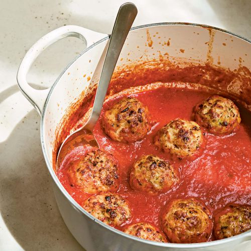Haal de gehaktballen uit de oven en leg ze in de sudderende saus. Voeg indien nodig nog eens 120 ml water toe zodat ze gedeeltelijk zijn ondergedompeld. Laat ze 6-10 minuten onder af en toe voorzichtig roeren zachtjes doorkoken tot ze gaar zijn. Haal ze van het vuur, dek ze af en laat ze tot serveren in de warme saus staan.